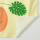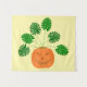This awesome tapestry features a digital art image of a series of leaves from a houseplant called a Monstera, also known as the Swiss Cheese Plant. The leaves are dark green and lobed and some have holes in them. The plant is contained inside a scary orange looking Halloween pumpkin with a wicked grin, sharp teeth and evil eyes.