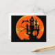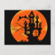 A spooky image of a creepy haunted house, complete with a flying bat overhead, all set against a blood orange full moon for Halloween.
