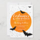 Costumes & cocktails! Celebrate your spooky Halloween and invite friends and family with this modern and simple elegant orange watercolor moon, black splatters, bats and typography. The colour background is fully editable, you can move the bats around.
