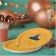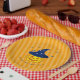 Halloween paper plates features orange sparkly stripes, kid-friendly pumpkin wearing a blue witch hat filled with sparkly white stars and blue bats flying.