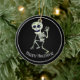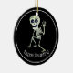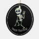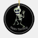 This ceramic porcelain ornament is shown in the round shape with a Halloween skeleton art print.
