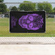This Halloween outdoor banner is shown in a scary haunted skulls print.