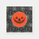Halloween party paper napkin is shown with a festive spider webs and pumpkin face print.