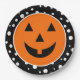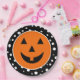 Halloween party paper plate is shown in a black and white polka dots design with a pumpkin face print.