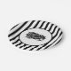 This Halloween paper plate is shown with a festive black and white stripes and spider design.