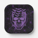 Halloween party paper plate is shown with a spooky faux glitter spider web and skull print.