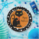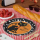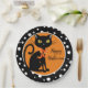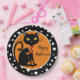 Halloween party paper plate is shown in a black and white polka dots design with a black cat print.