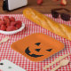 This paper plate is shown in a cute festive Halloween pumpkin face print design.