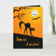 Halloween party invitation card with illustration of an evil black cat with jack-o-lantern face, flying bats and full moon, on black and orange.