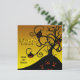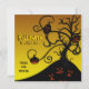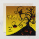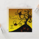A spooky-looking tree silhouette and hanging Jack o’ Lanterns with scary faces, on a glowing brown orange yellow background. Matching envelope: