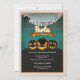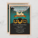 Three spooky pumpkins and a black cat set the scene for your Halloween Party. A trendy invitation with unique colours and varied font styles.