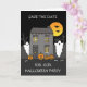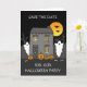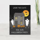 A simple illustration of a haunted house at night, with ghosts, bats, and pumpkin lanterns outside it. The words 'Save the date for your Halloween Party' accompany the image.