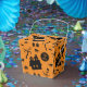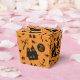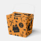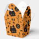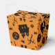 A Halloween trick or treat favour box for those candies and chocolates! It has many Halloween elements which include silhouettes of cats, bats, trees, tombstones, owls, withered trees, jack-o-lantern carved pumpkins and eerie looking possibly haunted houses. Text reads Trick or Treat. A colour palette of black and orange with bits of white.