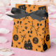 A Halloween trick or treat favour box for those candies and chocolates! It has many Halloween elements which include silhouettes of cats, bats, trees, tombstones, owls, withered trees, jack-o-lantern carved pumpkins and eerie looking possibly haunted houses. Text reads Trick or Treat. A colour palette of black and orange with bits of white.