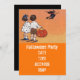 A party invitation suitable for a vintage Halloween themed party featuring vintage children illustration of a boy and a girl with a pumpkin looking at a witch on a broomstick cute theme. This invitation is fully customisable to include your own personal details.