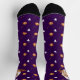 These spooky Halloween socks are decorated with funny pumpkins, ghosts, bats and scary eyes on a dark purple background imitating Halloween night.