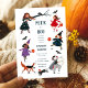 Adorable cute gender neutral little peek a boo Halloween illustrations baby shower party invitation, perfect Halloween baby shower, with cute illustrations featuring cute adorable little children with dress up kids Dracula costume, devil, witch, fox and a black cat, bat in the colours pastel grey, orange and purple with little black and red accent colours . A little boo is on the way! A not spooky Halloween baby shower. Original artwork by Caroline Bonne Müller