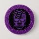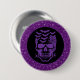 Halloween button pin is shown with a spooky skull print on a faux glitter purple colour background.