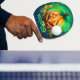 A ping pong paddle with a Halloween design, featuring a cartoon pumpkin with a smiling face and glowing eyes, set against a green and blue background with swirling vines and clouds, the word "HALLOWEEN" is written in a stylised font at the bottom of the paddle, the handle of the paddle is made of light-coloured wood with vertical grain patterns.