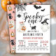 Celebrate with these fun and trendy "Spooky ONE" Halloween 1st birthday invitations. This modern 1st birthday invitation is featuring hand painted watercolor ghosts, black cats, pumpkins, bats and spider webs. Halloween pattern in the back. You can personalise the wording, font style, colour and size in front and back of the invitation. Please fell free to contact me for matching items.