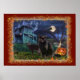 Spooky scene with two black cats in front of a haunted house with ghosts, bats, a pumpkin and a witch flying on a broom across a full moon. You can add some text, if you like. Makes a great Halloween decoration!
