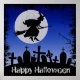 Halloween illustration with witch and gravestone decoration at full moon in grunge frame