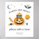 Halloween themed baby shower with watercolor jack-o-lantern pumpkin with black at hiding inside, moon, stars and bat. Babies are Sweet please take a treat, favour sign.