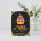 Adorable orange pumpkin with a gold unicorn horn and a purple witches hat. The black background has orange, yellow, green and purple Halloween confetti and floral flowers and leaves in the corners.