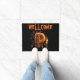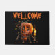 A halloween funny pumpkin jack-o'-lantern in the shape of the letter "P" holding a lamp with a flame.