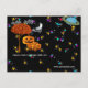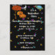 Halloween Invitation Featuring a Black Sky, Crescent Moon, Colourful Saturn, Clouds and more colourful stars abound. Cute Pumpkin Family standing next to a tree with orange fall colour Leaves and a Big BOO! With eyes atop the letters all inviting you to a most but not too spooky Halloween Harvest Party. Perfect for the Church Harvest Halloween Party too!