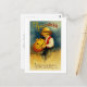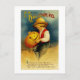 Vintage Halloween greeting card illustration showing a Victorian child carving a jack o' lantern with text "It's Halloween when little boys are frightened by the slightest noise, and little girls run off to bed and climb in quick, and hide their head."