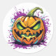 Round sticker is shown with a Halloween scary pumpkin print.