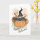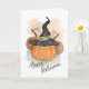 Celebrate Halloween with a touch of whimsy! This festive card features a cheerful pumpkin sporting a witch's hat, perfect for sending spooky wishes and Halloween cheer, and handwritten "Happy Halloween."