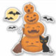 Cute black cat and a witch broom near a stack of laughing pumpkins that are falling over.