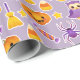 Cute purple halloween wrapping paper with pumpkins, brooms, stars, candy, owls and spiders.