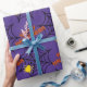 This adorable wrapping paper for Halloween has spider webs and spiders on a purple background. Orange Happy Halloween text.