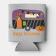 Fun Halloween graphic features retro style rv trailer in seasonal colours with pumpkin, spiderweb and bunting flags over the window, on grey background with orange "Happy Halloween" customisable text overlay.