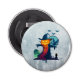 A round bottle opener with a cool halloween illustration. Set on a grey grunge background. A large scarecrow with a pumpkin head, wearing a witches hat. He has a menacing grin wearing tattered robes and is standing in a graveyard with a crow screeching on his arm. Bats flying off in the distance, a full moon in the background and a lone owl with glowing eyes sits on a tombstone.