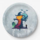 Paper plates with a cool halloween illustration. Set on a grey grunge background. A large scarecrow with a pumpkin head, wearing a witches hat. He has a menacing grin wearing tattered robes and is standing in a graveyard with a crow screeching on his arm. Bats flying off in the distance, a full moon in the background and a lone owl with glowing eyes sits on a tombstone.