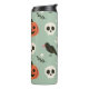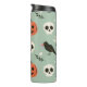 Halloween seamless pattern with ravens, skulls and thermal tumbler
