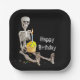 Sitting skeleton holding a cupcake with lit candle and colourful sprinkles for Halloween birthday party.