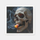 A skull holds a piece of candy corn in its teeth, exhaling whimsical swirls of smoke