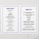 Nicely combined images of skulls and border compose this modern and fun yet elegant folded wedding program. A black and white skull couple with a purple hat for the groom and a bow for the bride and a skull border are the main elements on ivory background. The value paper type folds well. Choose it and fold in the centre to have a booklet folded program perfect for a Halloween or fun gothic wedding theme.
