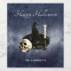 Design features a pointy witches hat, skull and bright burning candle on a navy blue grunge textured background with "Happy Halloween" in stylish typography . Easy to personalise with your own text.  Perfect for Halloween parties or favours.