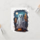 In the heart of an autumn forest, under a night sky lit by a full moon, a smiling ghost stands proudly. Its white sheet floats gently in the breeze, scattered with spots and holes that add to its spectral charm. At its feet lies a carefully carved pumpkin, whose illuminated eyes and mouth cast a warm glow on the forest floor. Fallen orange leaves surround the scene, while silhouetted bats fly in the distance, completing this visual celebration of the Halloween spirit.