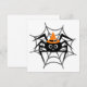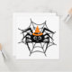A cute black spider dressed in an orange Halloween witch hat on Halloween Spider in Web T-shirts, bodysuits, cards, stickers, tote bags, magnets, and other Halloween design apparel and gift items.