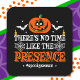 This funny Happy Halloween design is perfect for a spooktacular spooky season for & anyone who LOVES Halloween! Great for a kids Halloween costume party or to show your Halloween spirit all year long! Features 'There's No Time Like The Presence' funny Happy Halloween joke ghost spirit pun & cute spooky Halloween pumpkin face graphic.