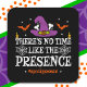 This funny Happy Halloween design is perfect for a spooktacular spooky season for & anyone who LOVES Halloween! Great for a kids Halloween costume party or to show your Halloween spirit all year long! Features 'There's No Time Like The Presence' funny Happy Halloween joke ghost spirit pun w/ spooky season hashtag & Halloween pumpkin graphic.