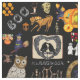 This fabric, with black background, has art by me, Kristie Hubler, all your favourite spooky themed halloween art, pumpkins with Edvard Munch style "Scream" faces, skulls with tattoos, the headless horseman with humble horse, carrying a pumpkin, riding in a pumpkin carriage, leaves, a squirrel throwing leaves in the air, a copper lantern, skeletons, "BOO" in fabric shaped letters, a witch on her broomstick, a pumpkin fairy, a tree come to life, a mysterious owl with pinecone pattern coat, "HALLOWEEN" in fabric shaped letter font, ravens kissing inside a black feathered, heart shape wreath artwork inside a book, apples, 3 cute ghosts wanting to trick or treat, different shape broomsticks, and a mirror, mirror, with sullen face, fortelling a story, inside a skull carved oval frame. All in basic repeat pattern. Artwork copyright protected by Kristie Hubler.