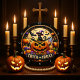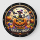 This image features a round wall clock with a festive Halloween theme. The clock face is adorned with various spooky but friendly characters and elements. A prominent carved pumpkin with a smiling face is at the bottom centre. Perched on top of the pumpkin is a black cat wearing a purple witch's hat. Surrounding these main figures are bats flying under a crescent moon, a friendly white ghost, a witch's broom, and numerous pumpkins and colourful flowers in shades of orange, purple, and green. The phrase "TRICK or TREAT" is displayed prominently on a banner at the bottom. The clock has a black frame with white numbers from 1 to 12.